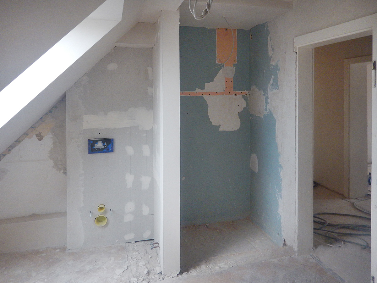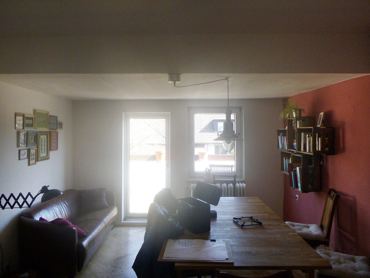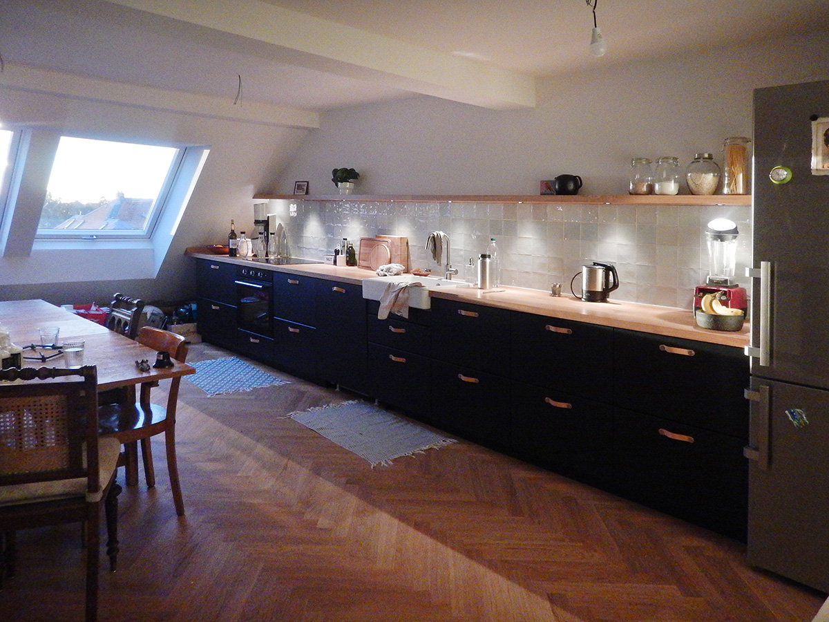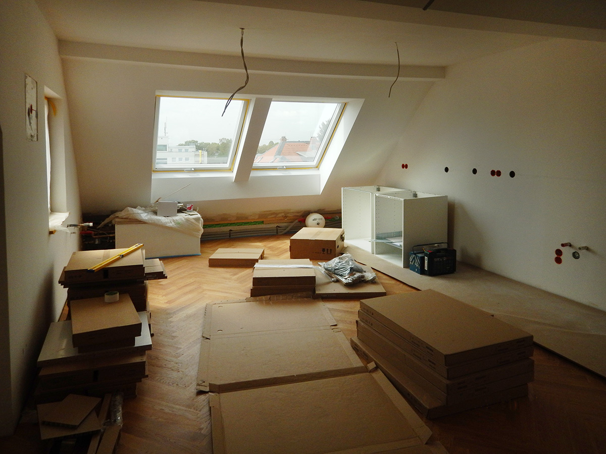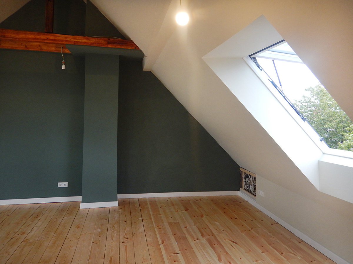 Die bereits als Maisonette-Wohnung bestehende Dachgeschosswohnung wurde in einer Komplett-Renovierung umgestaltet und mit einem zweiten Fluchtweg versehen. Einige Zwischendecken und Trempelwände wurden entfernt und die Belichtung veränderte sich durch den Einsatz von großzügigen Dachflächenfenstern. Im Zuge der Renovierung wurden Dachflächen und Außenwände mit einer innenliegenden Dämmung versehen. Diese Maßnahmen, wie auch die neuen Fenster, mussten sich bauphysikalisch auf das denkmalgeschützte Gebäude von 1894 einstellen. Sie wurden im Rahmen eines KfW-Effizienzhauses 160 gefördert. Die Baumaßnahme wurde in der zweiten Jahreshälfte 2020 durchgeführt.