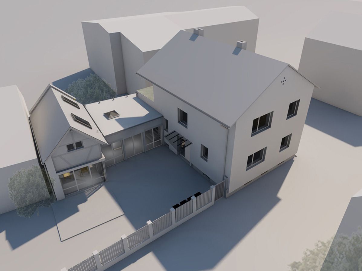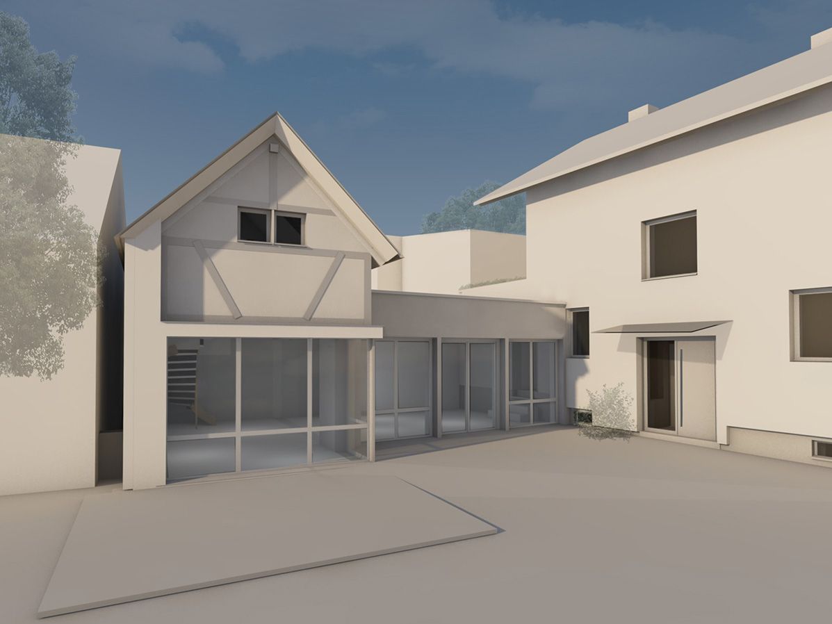 Das teilsanierte Gebäude aus den 30er-Jahren und ein Nebengebäude aus der Zeit um 1900, werden durch einen Zwischenbau verbunden. Die bestehende Garage auf der Fläche des Zwischenbaus wird dazu abgerissen. Das gesamte Ensemble wird energetisch saniert, die Raumkonzeption für das Einfamilienhaus wird durch den Umbau optimiert. Durch die energetische Sanierung entsteht ein KfW-70-Gebäude.
