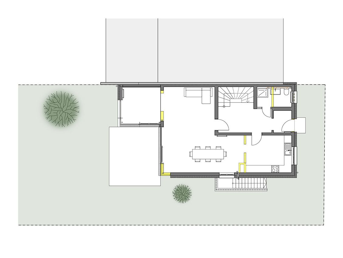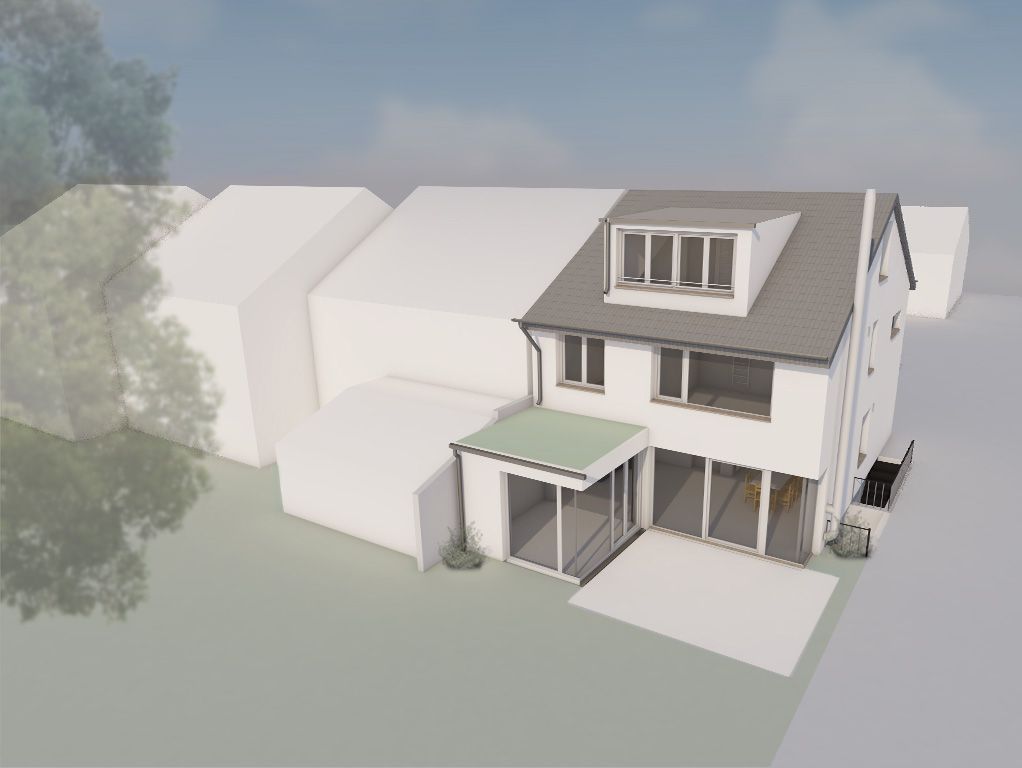 Das Reihenhaus von 1960 wird für eine junge Familie moderat umgebaut und komplett saniert. Sanierungsstandard ist ein KfW70-Haus, mit ökologischer Energieversorgung (Wärmepumpe und PV-Anlage). Durch einen kleinen Anbau und die Klärung des Erdgeschoss-Grundrisses entsteht ein großzügiger Wohnraum. Der Ausbau im Dachgeschoss wird mit einer neuen Treppe erschlossen. Bauzeit: Juni bis Dezember 2021.